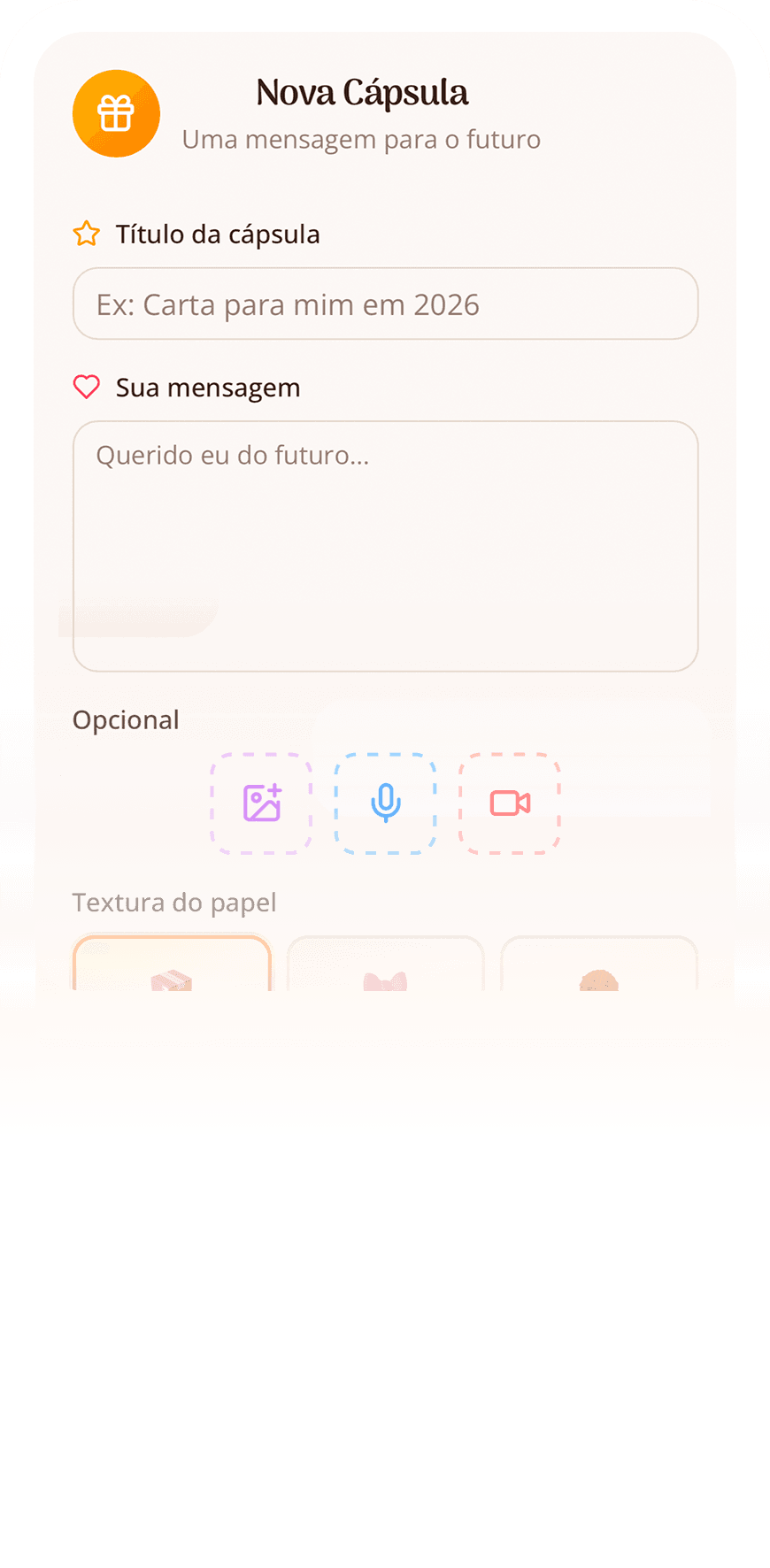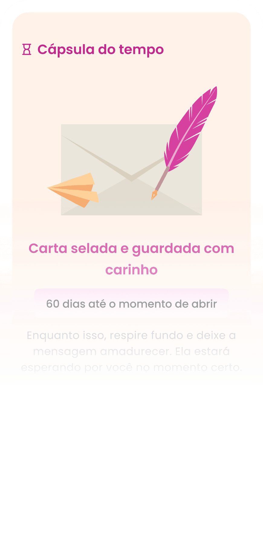 Escreva uma carta para a sua versão futura, sele a mensagem e escolha quando ela será aberta. Um convite para se reconectar com seus sonhos no momento certo.