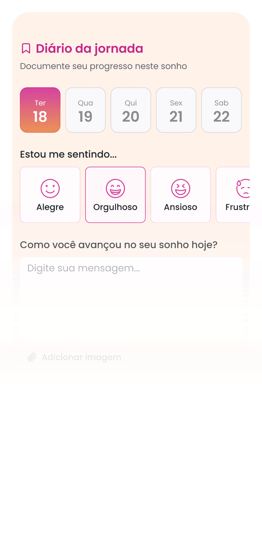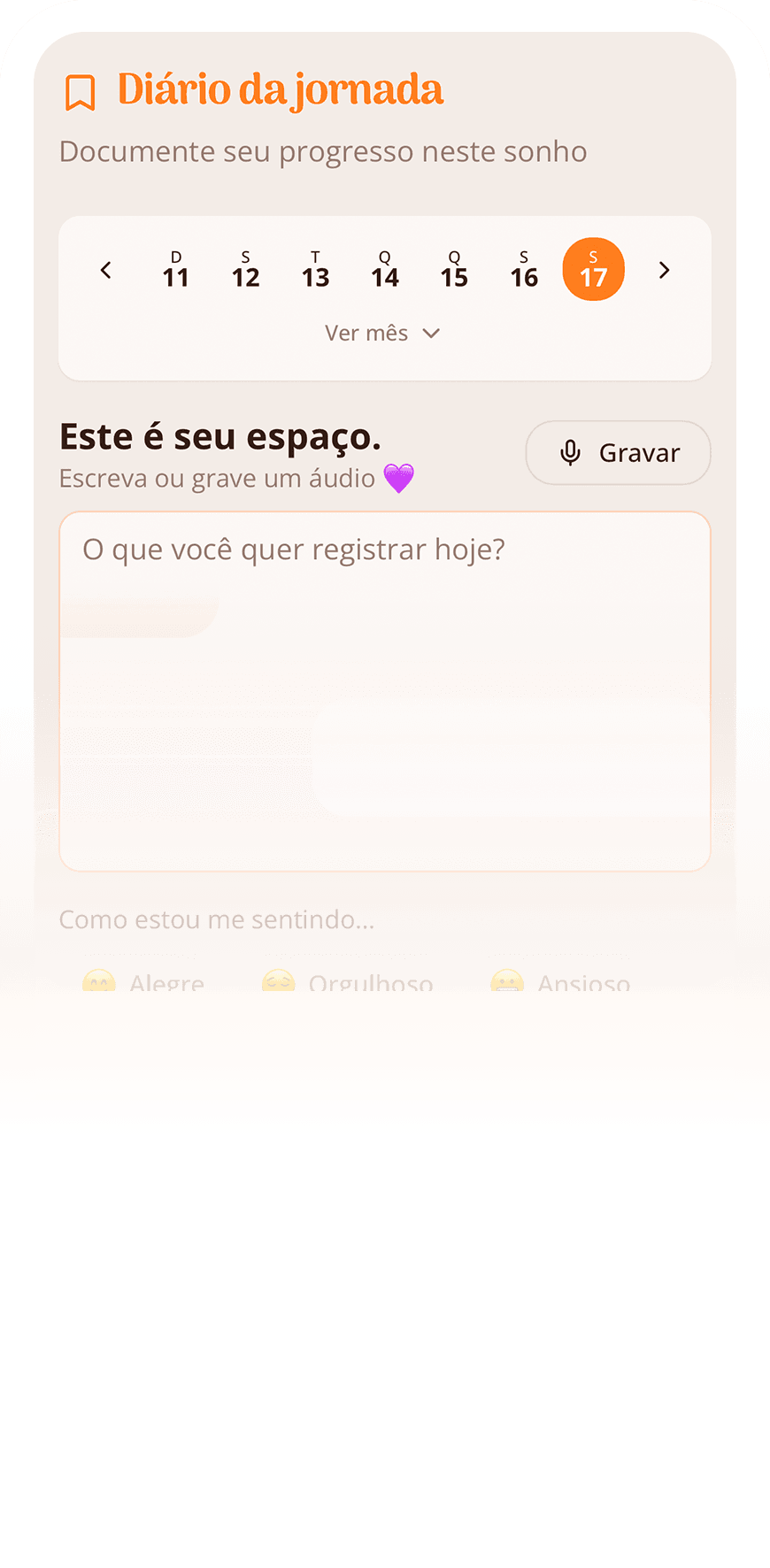 Registre aprendizados e momentos importantes da sua caminhada. Transforme o processo de sonhar em uma memória viva da sua jornada.