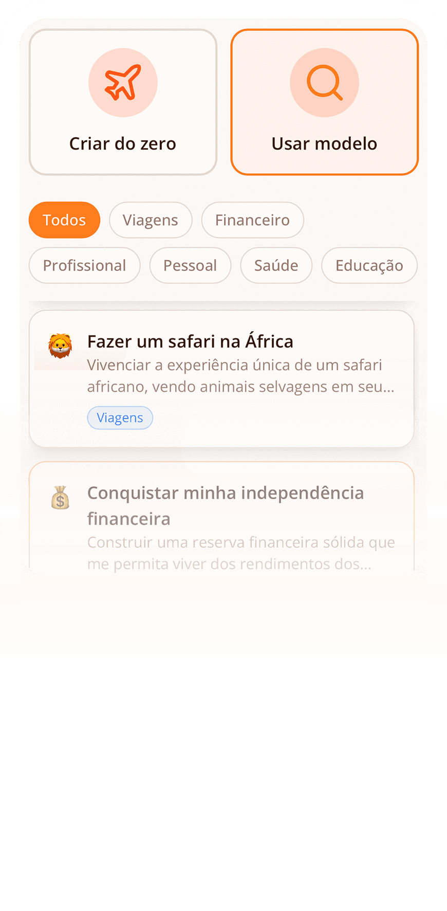 Com a ajuda da nossa IA, transforme seus sonhos em metas menores e realizáveis.