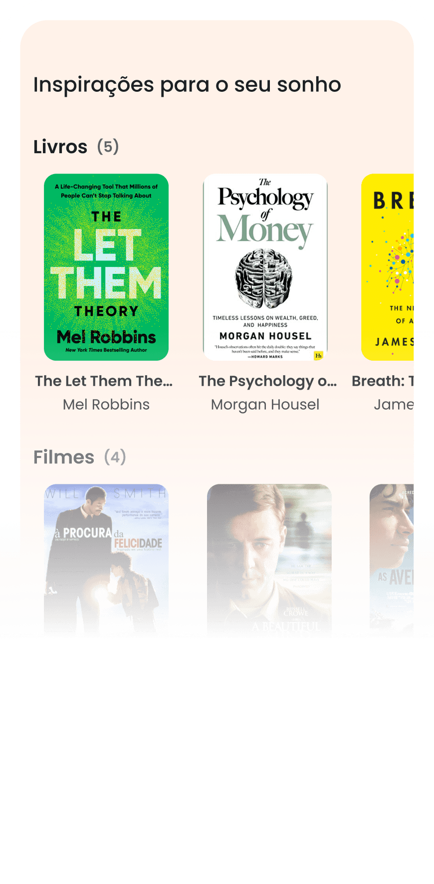 No app, jornadas guiadas ajudam a dar clareza e transformar sonhos em passos possíveis, com ferramentas pensadas pela psicologia da realização.